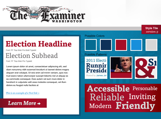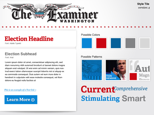 In un recente progetto, il team di design di Phase2 Technology ha lavorato con The Washington Examiner per creare un microsito per la campagna delle elezioni del 2012 che fornisca informazioni politiche minuto per minuto. L’obiettivo del sito era quello di estendere lo storico brand di Examiner con un tono più patriottico per motivare i lettori per le prossime elezioni. Usando gli aggettivi che aveva fornito il team del Washington Examiner, Phase2 ha interpretato il brand del giornale esplorando tre opzioni stilistiche differenti tra cui il cliente potesse scegliere. Gli stili riflettevano le interpretazioni delle tre varianti del loro attuale brand online.