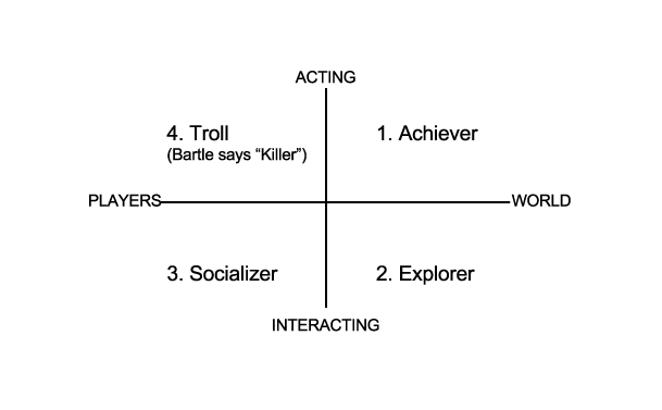 Ci sono molti modi per raggruppare le persone per stile di interazione incluse le sei categorie di comportamento del giocatore di Hallford e il raggruppamento statistico dei tre tipi di giocatore (PDF) di Yee, ma io trovo che questi approcci mappino più o meno i 4 tipi di giocatore di Bartle (in particolar modo i tre non-Troll). La teoria di Bartle è tra gli approcci più comuni scelti dai game designer (Fig 1).