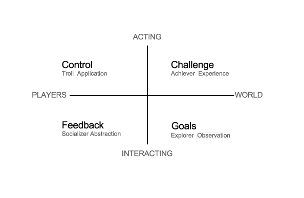 Vedendo questo ciclo attraverso i tipi di giocatore di Bartle, è possibile allineare le caratteristiche del player con aspetti del ciclo di Lewin: gli Achiever fanno concretamente esperienza del mondo, gli Explorer riflettono su quello che vedono, i Socializer riassumono il mondo in un contesto che possono discutere e i Troll premeditano il loro approccio alle interazioni. Questa mappatura funziona anche con gli assi di Bartle (Fig 5).