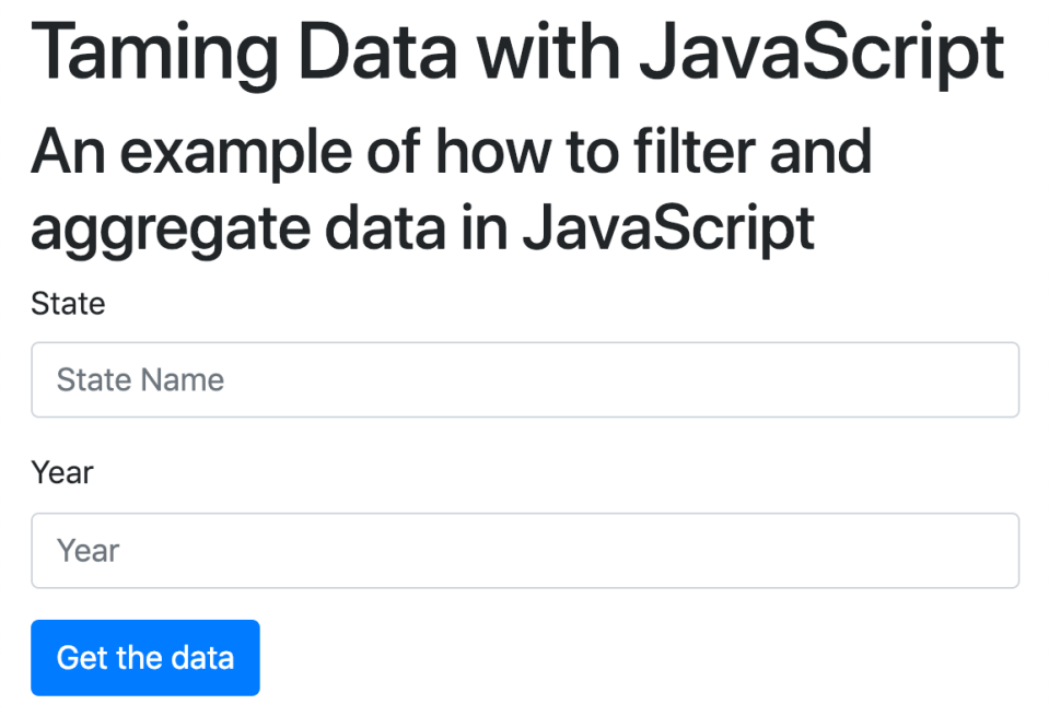 Se lasciate vuoto lo stato o l’anno, quel campo andrà di default a “All”. Il seguente codice è disponibile in /js/main.js. Dovreste osservare la funzione filterData(), che è dove teniamo la porzione più grossa delle funzionalità di aggregazione e filtering.