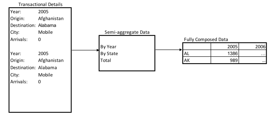 Il nostro obiettivo, qui, è di identificare le dimension chiave che ci servono per fare i report – anno e stato – prima di aggregare il numero di arrivi per quelle dimension, rimuovendo il paese di origine e la città di destinazione. Potete far riferimento allo script di Node.js /preprocess/index.js sul repo GitHub per maggiori dettagli su come farlo. Genera il file aggregate.json caricato da fetch() sopra.