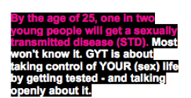 Questo tono neutro probabilmente non farà scappare i teenagers, ma li spronerà ad agire? Confrontatelo con un altro esempio: GYT (“Get Yourself Tested”) [Fai le analisi, ndr] su It’s YOUR (Sex) Life, una campagna sponsorizzata da MTV e dalla Kaiser Family Foundation. Lo slang del web e dei cellulari è il fulcro della campagna. Mi sono chiesta, insieme a Tracy Clark-Flory di Salon.com, se usare questo gergo non sia osare troppo, come una mamma di mezza età che si mette i vestiti di sua figlia adolescente. Ad esempio, leggete questo testo preso dalla pagina principale di GYT.